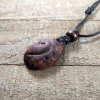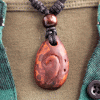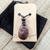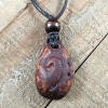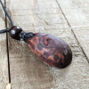 I cut this avocado pit myself, primarily with a hobby knife. I then fit it with a wooden bead. To better protect the wood from warping and cracking, I polished it with beeswax and orange oil.