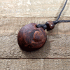I cut this avocado pit myself, primarily with a hobby knife. I then fit it with a wooden bead. To better protect the wood from warping and cracking, I polished it with beeswax and orange oil.